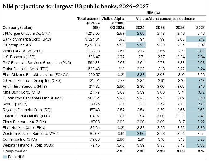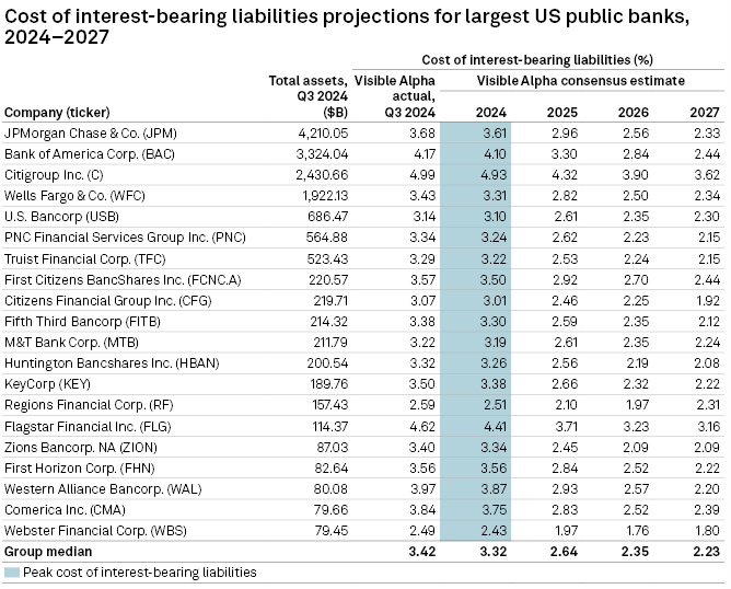 而且标普分析师还臆测,到 2025 年,统共20家最大银行的计息欠债成本齐将下落,而况大多数银行在接下来的两年内将持续呈下落趋势。收尾 12 月 12 日,分析师对该集团的普遍预期中值是 2024年为3.32%、2025年为2.64%、2026年为2.35%、2027年为2.23%。
